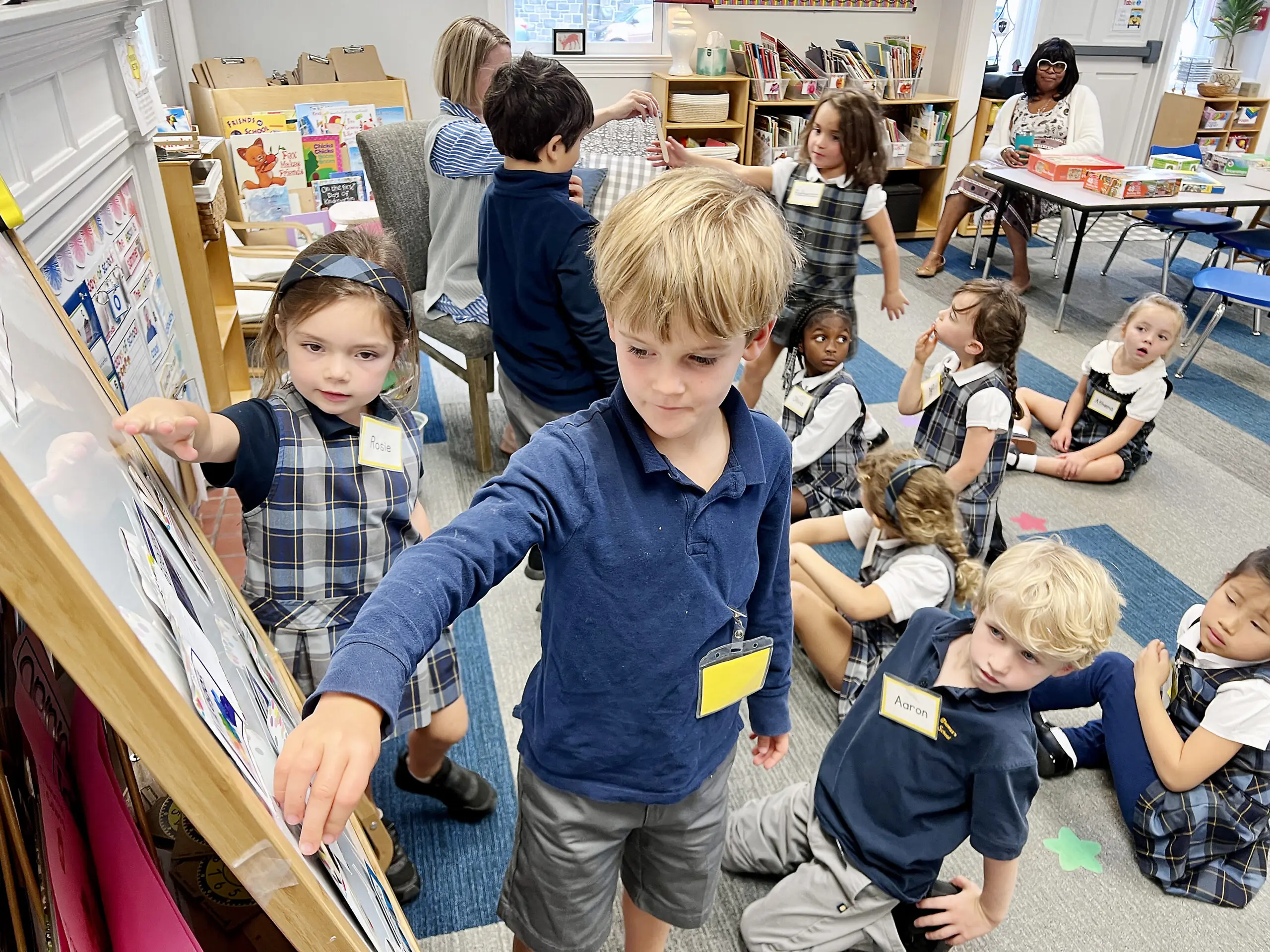 Learning is embedded in everything children do at St. Thomas’s Day School. Whether it be moving their name rock upon arrival at school each morning, checking the morning message or counting the number of pellets needed to feed Walter, the class turtle, Kindergarteners begin using academic skills on their very first day in school. The classroom is set up with fun and interesting materials that invite children to explore and learn academic skills within the context of play. The teachers carefully construct the classroom environment with learning goals in mind, including letter identification, number sense, language development, patterning and writing. In addition, academic skills are introduced in Morning Meeting and reinforced during small groups. Each child is nurtured to progress at his/her own pace in a developmentally appropriate way through exposure to materials that promote learning.