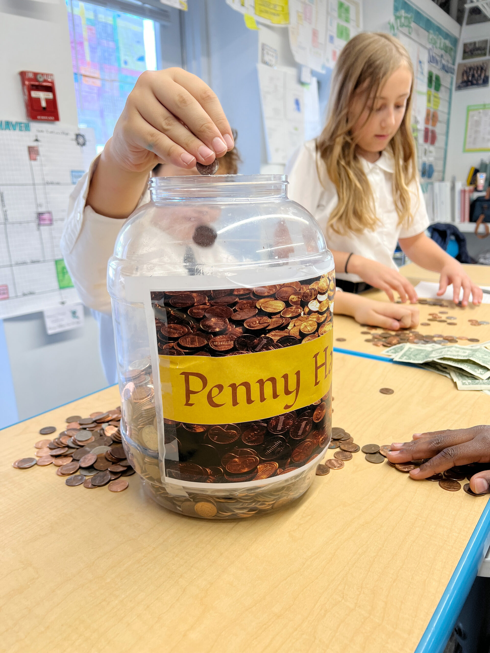 The Grade Six experience is especially meaningful. In October, the class was divided into three groups, each of which selects a deserving charity. They then created short, persuasive skits to champion their chosen cause during Morning Gathering. During the next week, our community cast their votes, selecting the organization that received the Penny Harvest funds. From there, the Grade Six leaders managed the entire process, collecting and counting the mountain of pennies (and dollars) donated by the school and in mid-November, they delivered a check to the selected charity. This year’s choice was The Animal Haven, an animal shelter located in North Haven CT, which provides humane refuge to homeless, abandoned and surrendered cats and dogs.