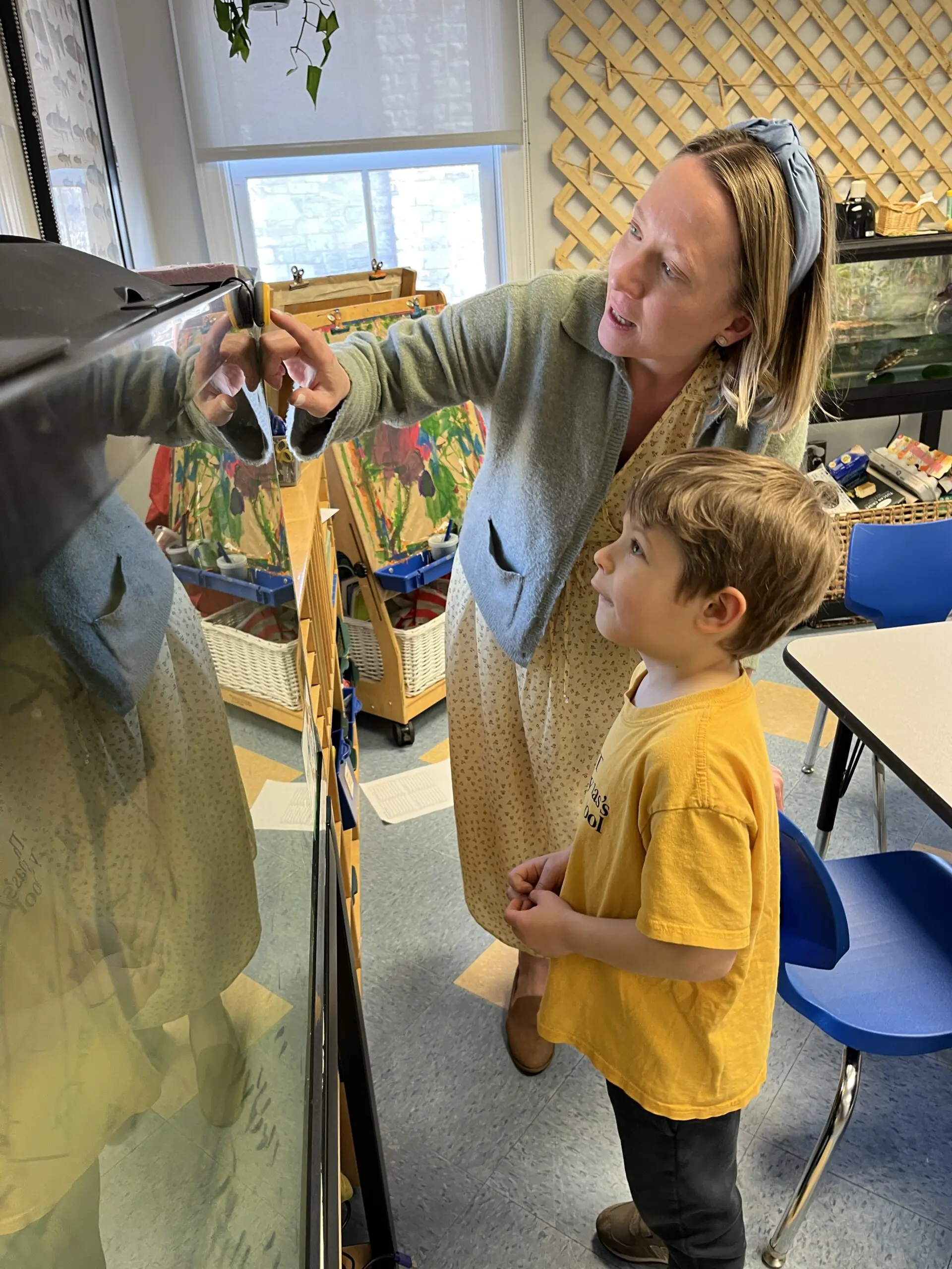 In January, Ms. Clark, Kindergarten Head Teacher, ceremoniously removed the sign: “Trout Eggs Coming in January” from the glass tank in the classroom. Sixteen excited students gathered around as 200 tiny trout eggs arrived. With noses pressed to the glass, they watched as Ms. Clark gently transferred them into a small hatching basket, which is placed inside the tank but sits closer to the top. This basket helps keep the eggs in one place and lets the students observe them more easily. From that moment on, the students became scientists.